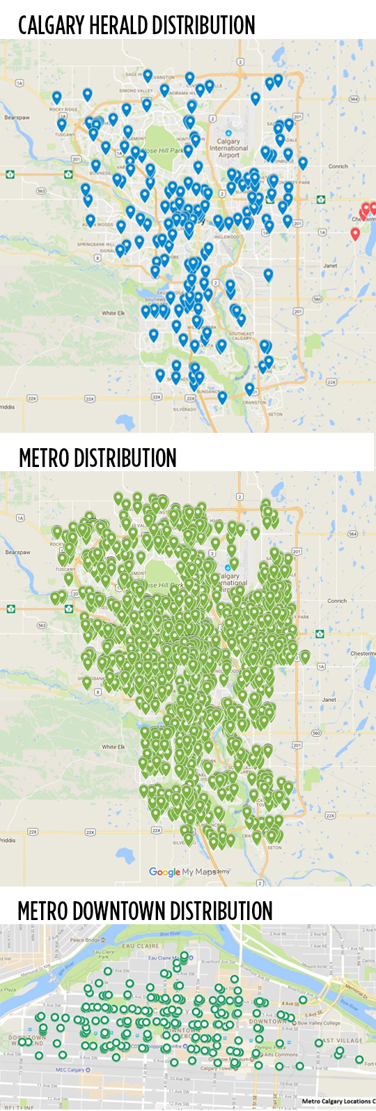 Getting more papers out is great news for CREB® members, but getting them read is even better. Metro’s model is built to distribute to as many readers as possible, reaching people where they are every weekday – in cafés, on transit, in strategic green boxes at key points throughout the city, and hand-delivered by Metro promoters at key points on Calgarians’ morning commute. Metro Calgary has more than 3,775 distribution points across Calgary, compared to the Herald’s existing distribution model, which has only 347.